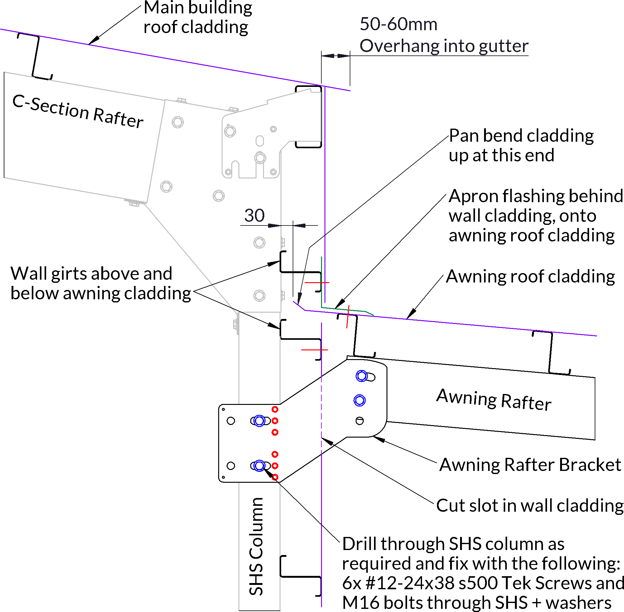 Stepdown awnings that connect to SHS main building columns follow the same geometry, purlin/girt and cladding as C-Section columns with the exception of the Awning Rafter Bracket to SHS fixing.