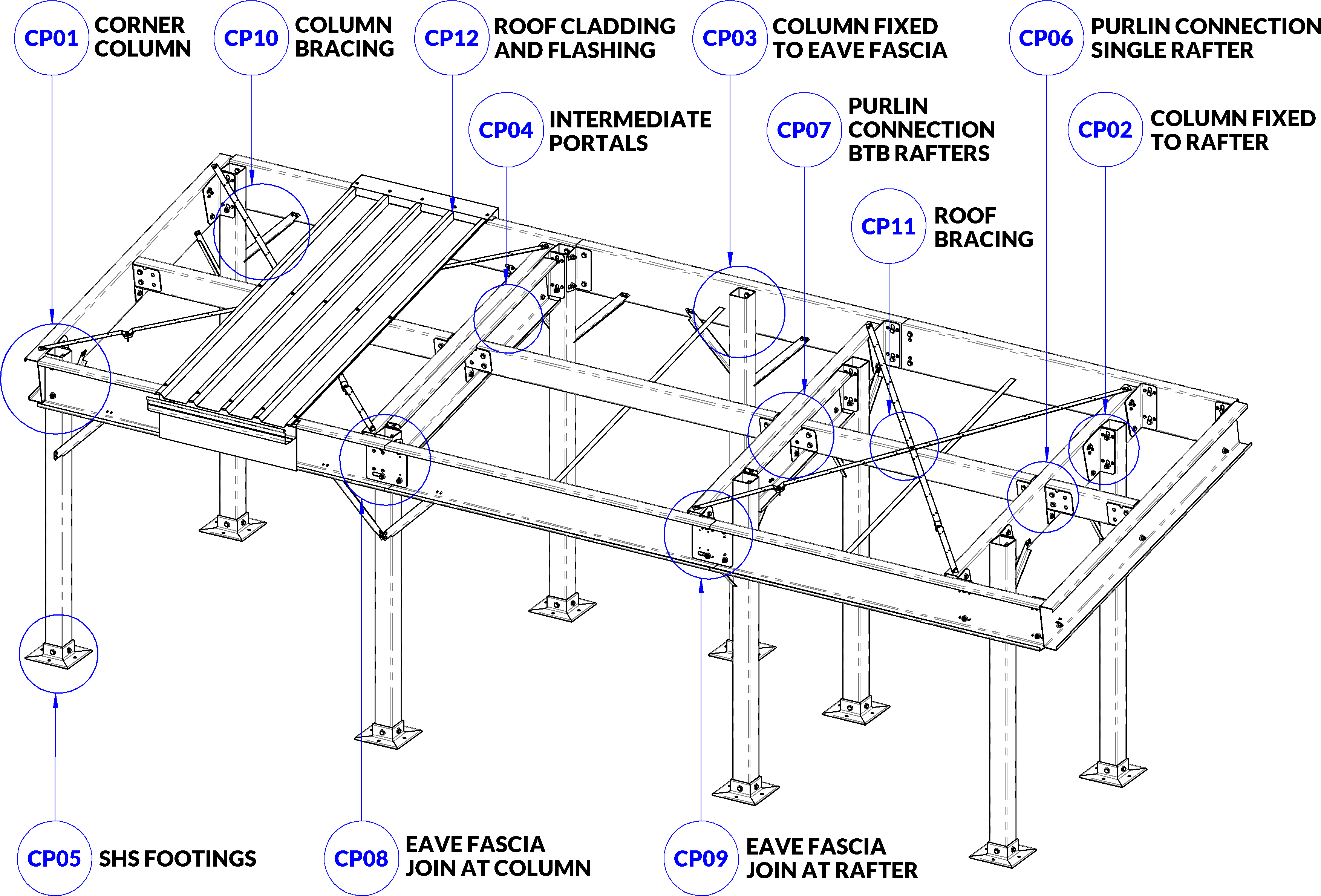 Various aspects of the skillion carport construction are ballooned below and detailed in the following pages. Only the part relevant to your design are included. NOTE: The skillion carport roof is designed as NON FOOT TRAFFICABLE.