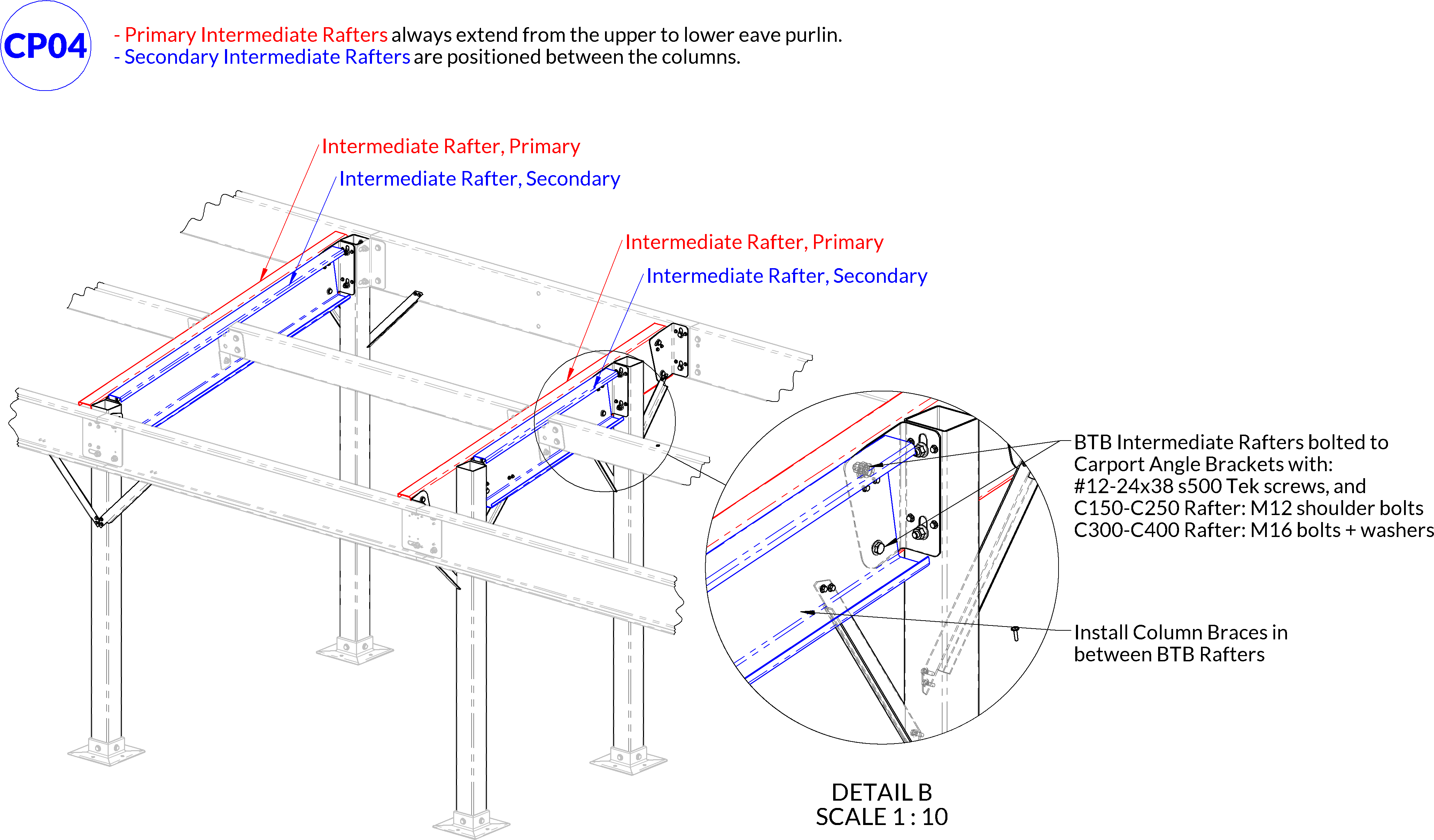 Skillion carport intermediate portals always have back to back rafters.