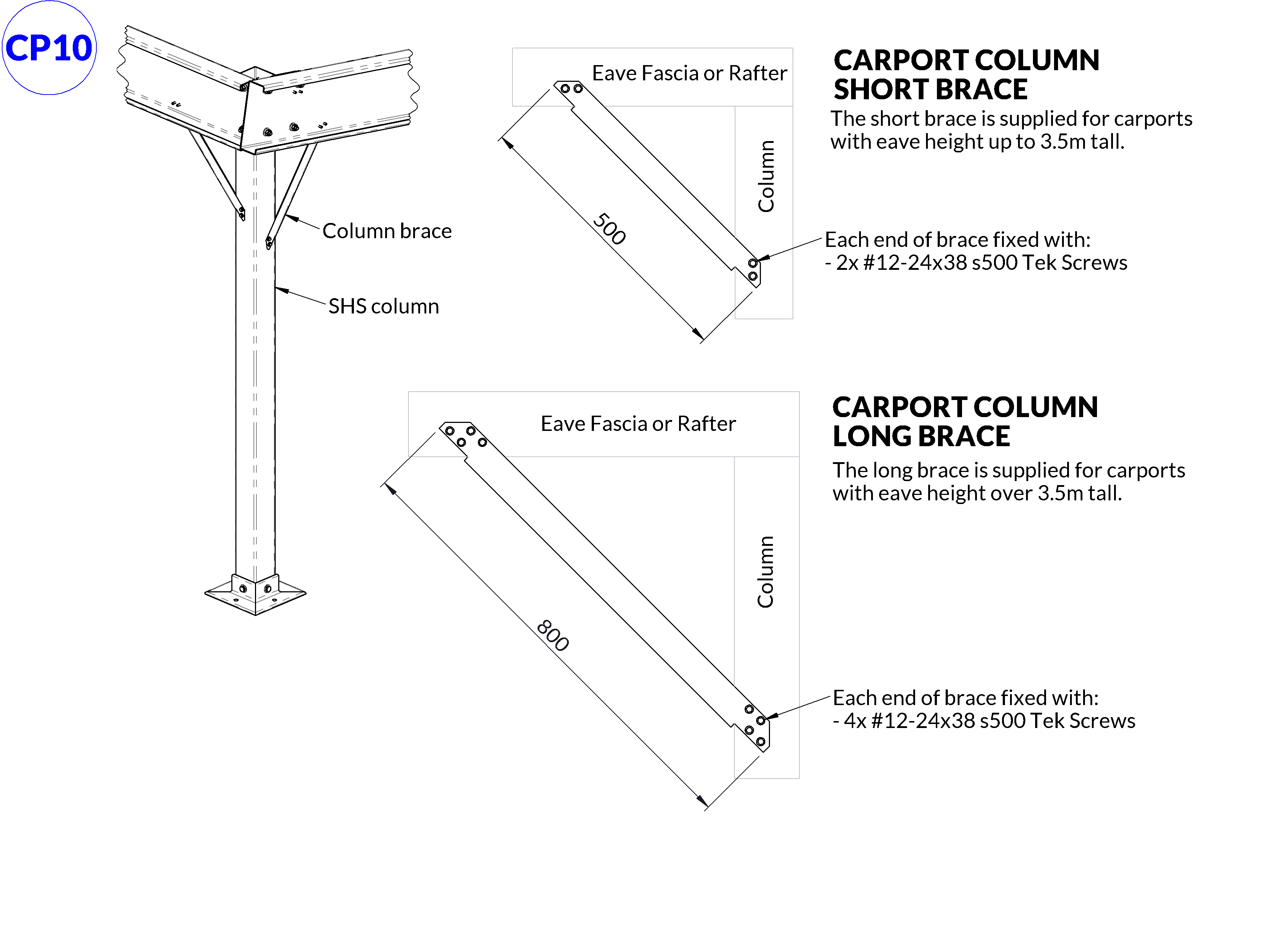 Column braces are supplied when using on-slab column footings. Column braces are used to brace the SHS columns to the rafters or eave fascia to increase lateral stiffness of the structure. Refer to engineering drawings for column brace locations.