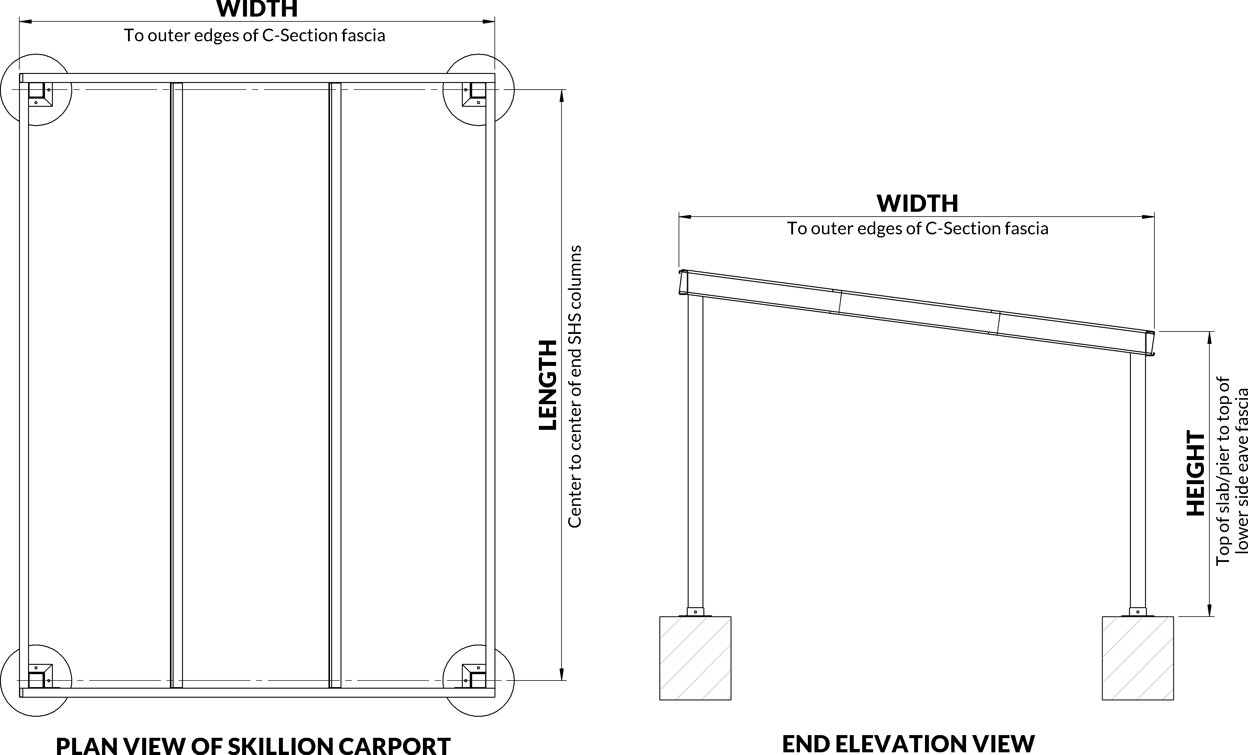 The nominal dimensions of a skillion carport are determined by the LENGTH - WIDTH - HEIGHT shown here:
